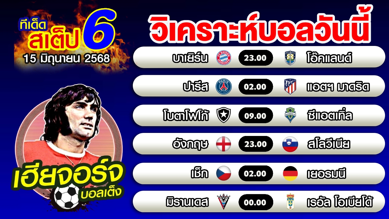 ชิงแชมป์ สโมสรโลก (FIFA Club World Cup) รอบแบ่งกลุ่ม เวลา 23.00 น. บาเยิร์น มิวนิค พบกับ โอ๊คแลนด์ ซิตี้